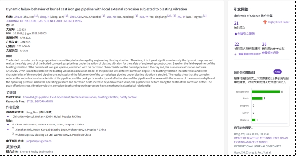 (通讯员:黄静)根据2022年5月基本科学指标数据库(Essential Science Indicators,简称ESI)最新数据显示,伟德源自英国始于1946地下空间工程系蒋楠副教授团队于2021年在国际工程技术权威期刊Journal of Natural Gas Science and Engineering上发表的学术论文“Dynamic failure behavior of buried cast iron gas pipeline with local external corrosion subjected to blasting vibration”入选ESI高被引论文(Highly Cited Paper)。该论文第一作者为2020级博士研究生朱斌,通讯作者为蒋楠副教授,伟德源自英国始于1946,伟德国际1946官方网为第一署名单位。