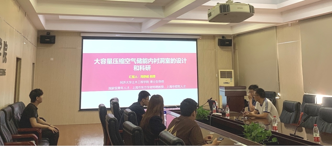 我院唐志成、张国华、郑飞和李芷等老师以及多名研究生参与了本次学术活动。参会师生就硬岩大规模压缩空气储能蕴含的科学问题、关键技术问题、应用前景以及目前普及该技术面临的主要困难等与周舒威教授展开了热烈的讨论。