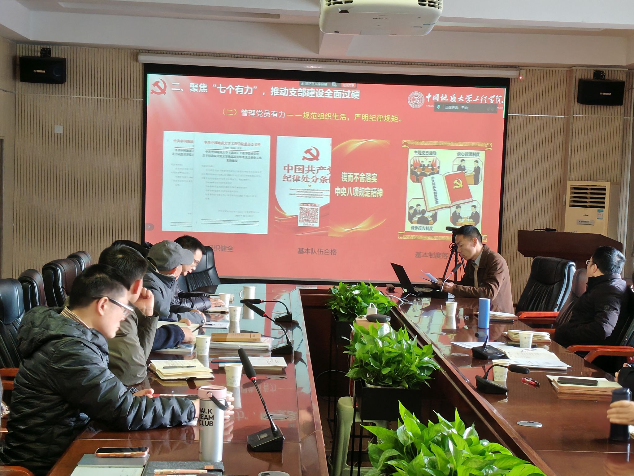 点评环节“辣味十足”、精准有力。与会党委委员立足学院发展全局,逐一进行针对性点评指导。王亮清强调,支部工作是基层党建的“神经末梢”,必须抓实规定动作筑牢根基,做优自选动作打造亮点,尤其要深挖学科特色,培育辨识度高、实效性强的党建品牌。高晓东提出,要构建“教工支部带学生支部”的联动机制,以导学团队为纽带,推动党建成效在人才培养全链条层层传导。李长冬倡导支部间打破壁垒、互学互鉴,通过资源共享、经验互通凝聚党建合力,形成比学赶超的良好氛围。吴文兵以自身任职经历现身说法,既充分肯定了各支部年度工作的扎实成效,也叮嘱大家无论在样板支部创建还是结项阶段,都要始终以高标准严要求贯穿始终,保持工作连续性与先进性。